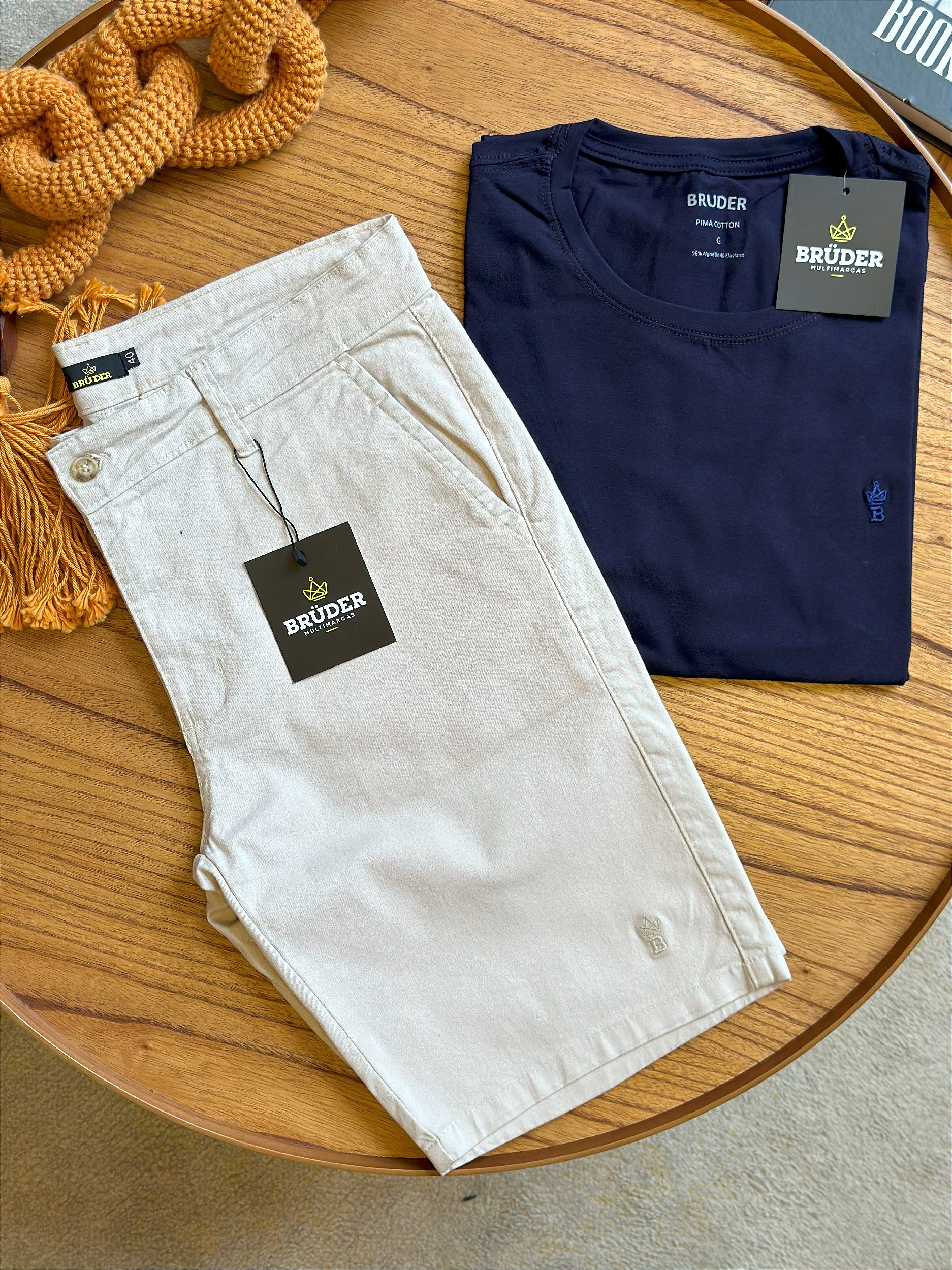 Kit Bermuda Sarja Areia + Camiseta Cotton Pima Marinho Bruder