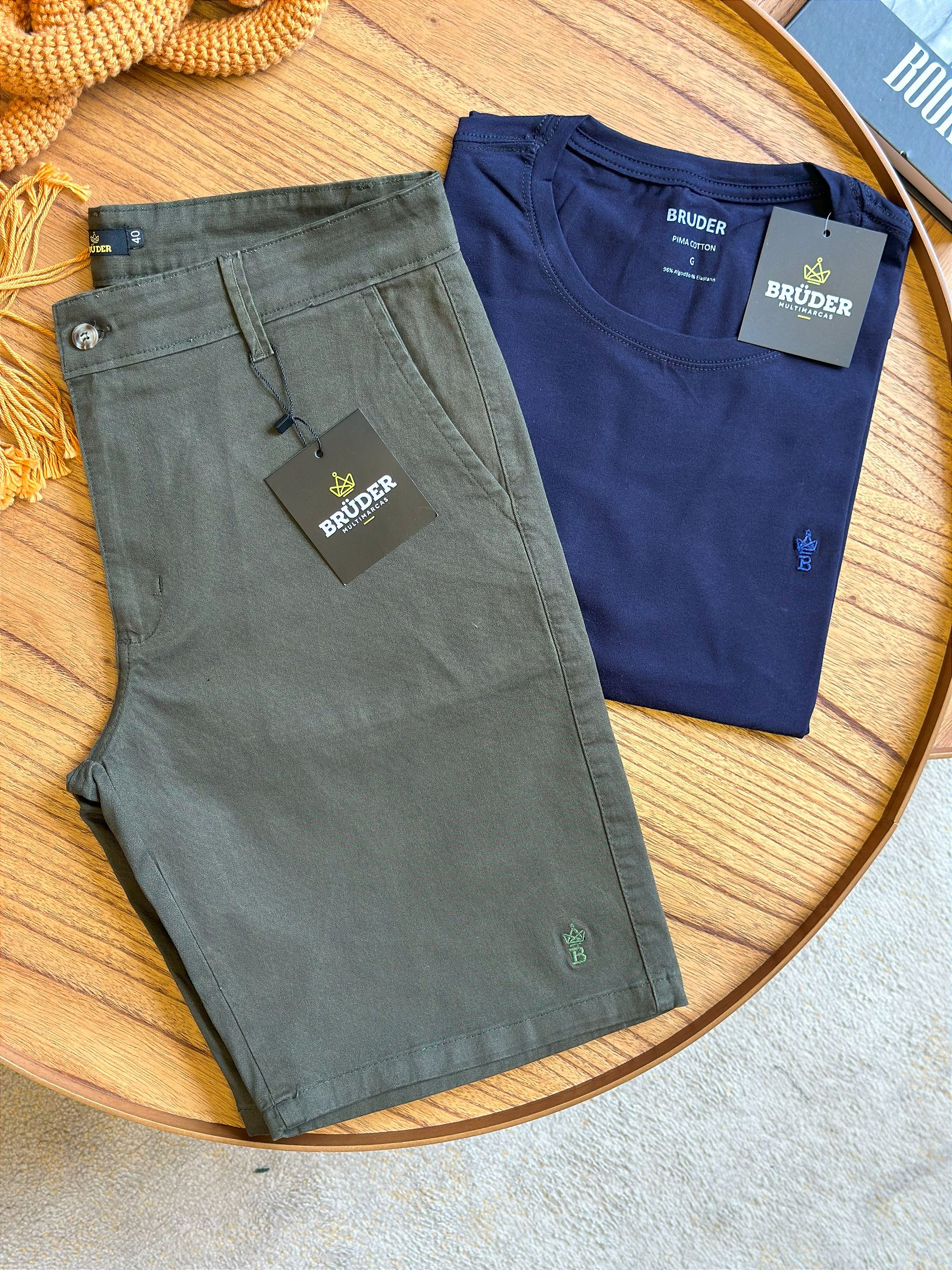 Kit Bermuda Sarja Verde + Camiseta Cotton Pima Marinho Bruder