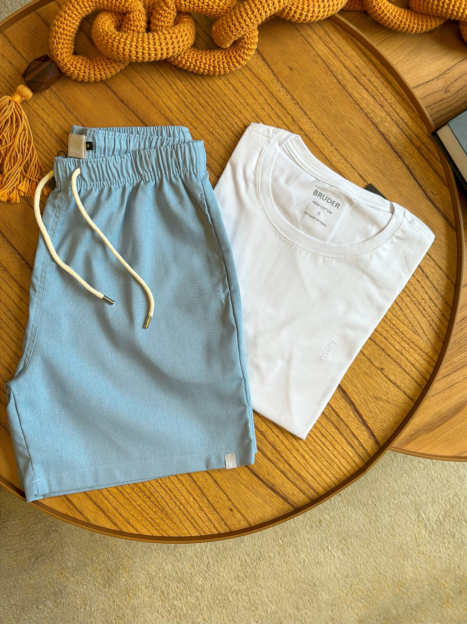 Kit Shorts Linho Azul Bebe + Camiseta Cotton Pima Branca Bruder