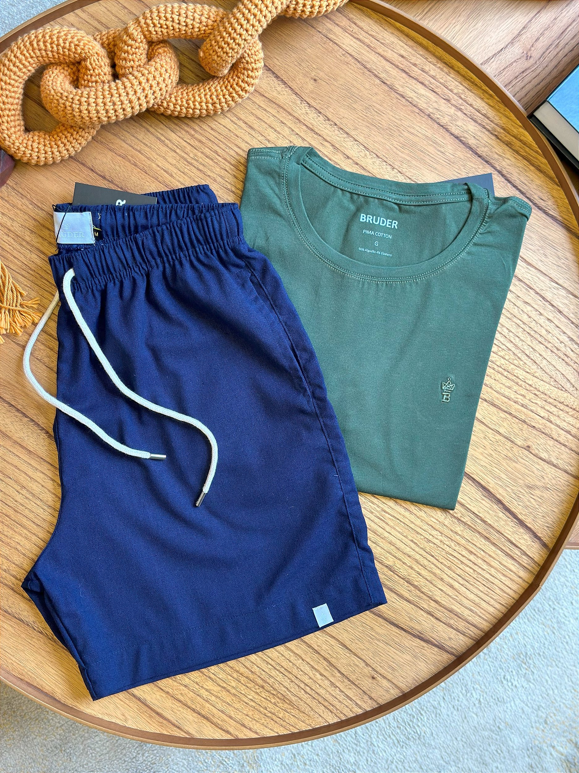 Kit Shorts Linho Marinho + Camiseta Cotton Pima Verde Musgo Bruder